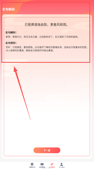 4、在名句解析区域,挑选经典名句进行学习,理解其深刻意义与运用,提高个人的文学素养。