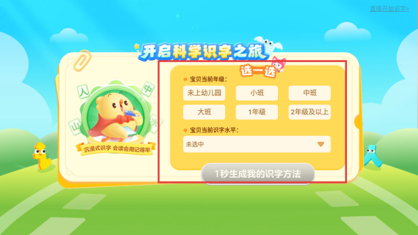1、打开识字APP,在初始界面根据宝宝实际情况选择【宝宝当前年级】和【宝宝当前识字水平】,点击【1秒生成我的识字方法】。