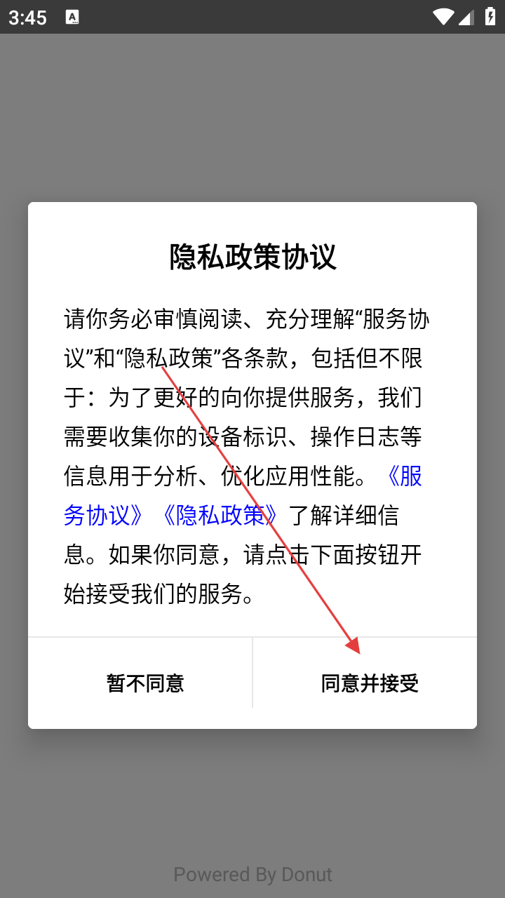 1、首次打开应用,需处理【隐私政策协议】,同意点【同意并接受】进入。