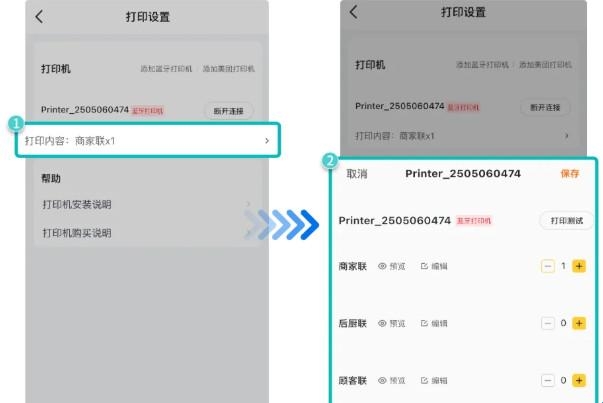 3、回到打印设置界面,点击打印机下方的“打印内容”可进入选择或编辑小票模板,完成编辑修改后「保存」即可。