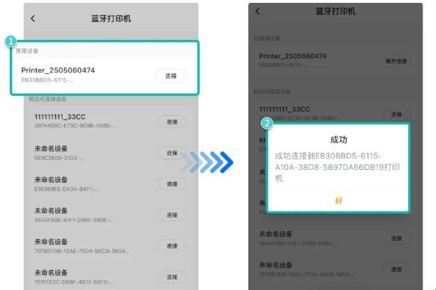 2、在蓝牙打印机列表中找到目标打印机,点击它右侧的「连接」,连接成功后会有弹窗提示。