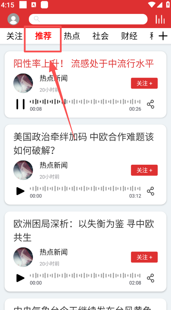 1、在软件主界面,点击 “推荐” 标签,可浏览各类推荐的资讯内容。