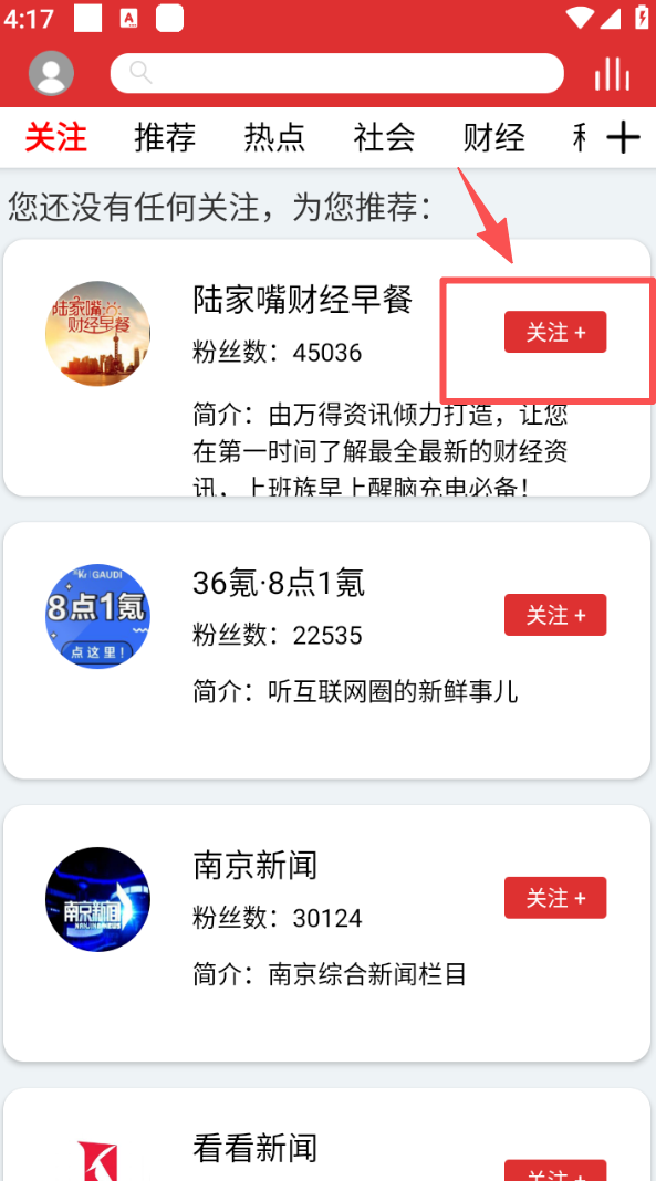 3、切换到 “关注” 标签页,看到感兴趣的资讯账号,点击 “关注 +” 即可关注。