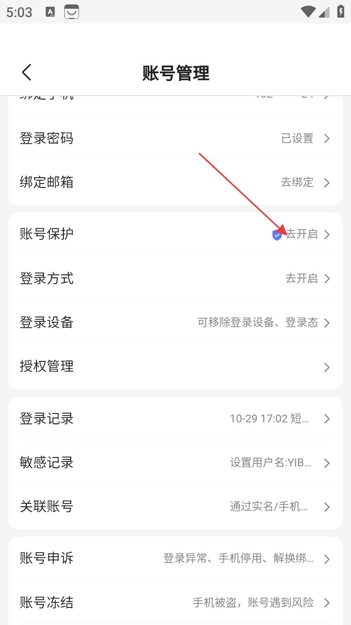 4、在账号管理页面,点击【账号保护】后的【去开启】,按照提示开启账号保护功能。