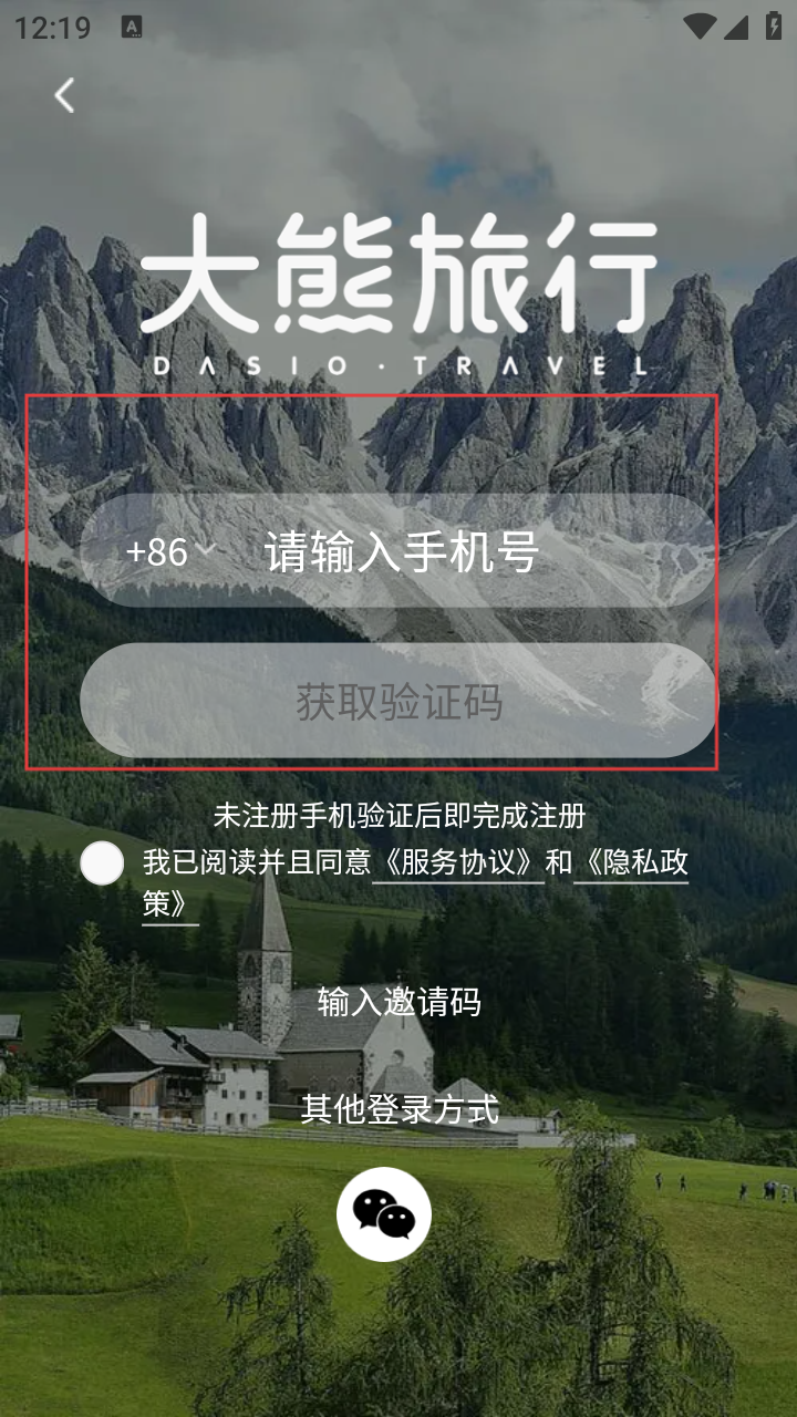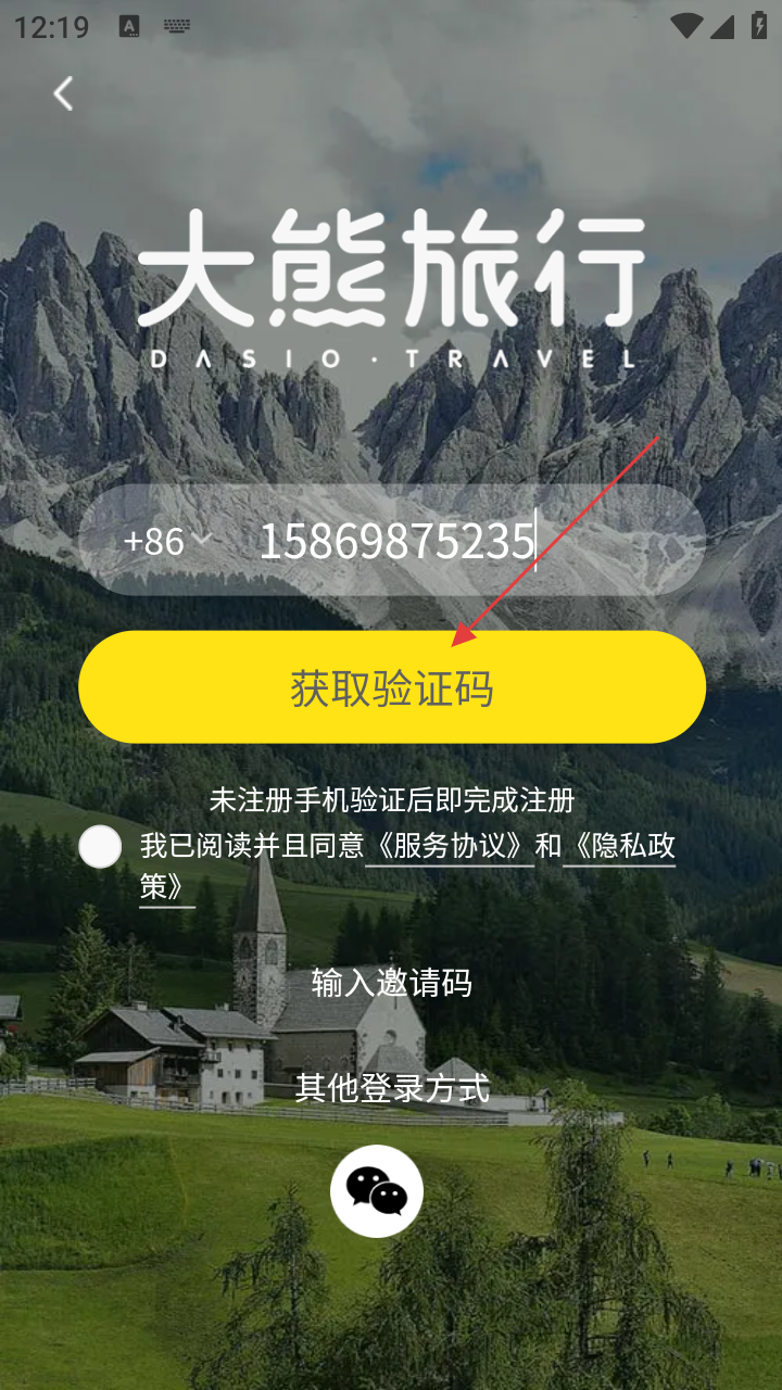 4、在【大熊旅行】登录时,输手机号后点【获取验证码】,即可完成登录或注册,也可选其他登录方式。