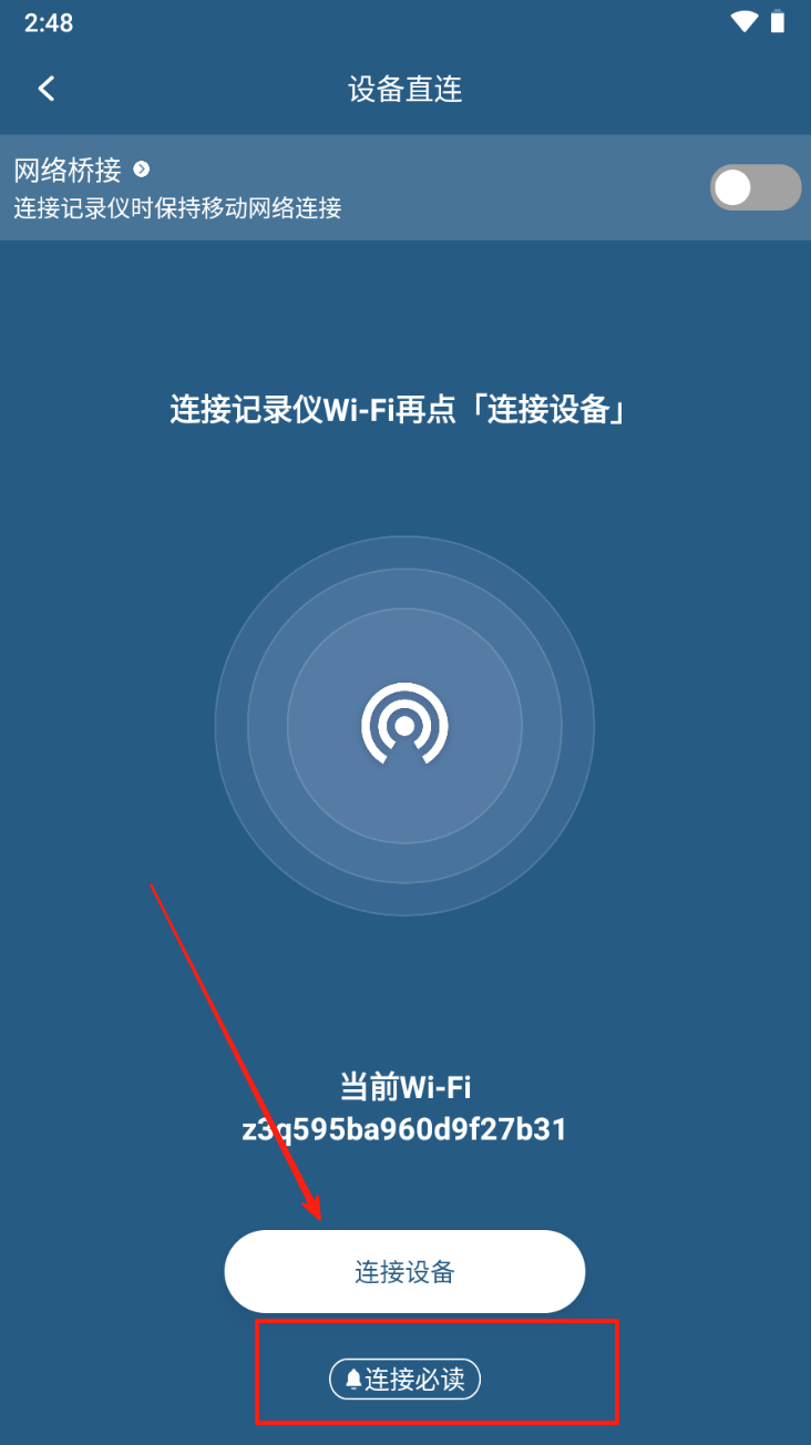 3、连接Wi-Fi。在设备直连页面,点击“连接设备”按钮,并确保手机连接到正确的Wi-Fi。