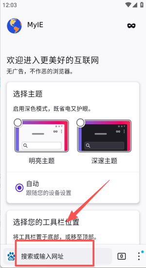 2、按习惯把工具栏置底或顶,单手输入网址搜索更顺手。