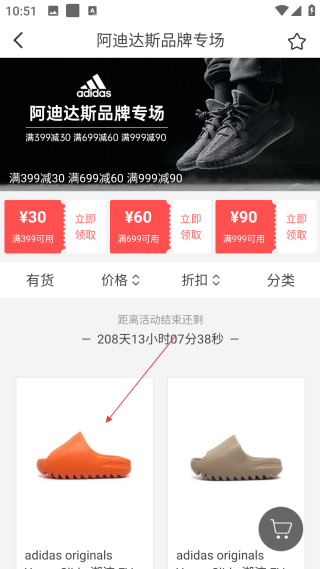 2、在品牌团页面,点击【阿迪达斯品牌专场】,进入该专场的商品列表页面。