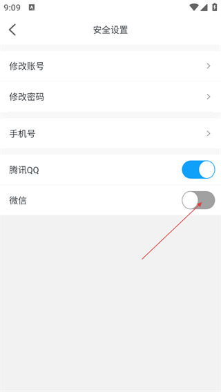 4、在安全设置页面,点击【微信】对应的开关按钮,开启微信绑定功能,完成账号与微信的关联,提升账号安全性与登录便捷性。