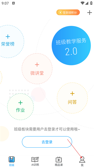 1、在APP“班级”页面,点击底部导航栏的【我】,进入个人中心;若未登录,先点击【去登录】完成账号登录。