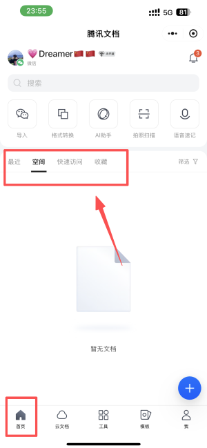 1、点击首页的“空间”选项,查看和管理您的文档存储空间。
