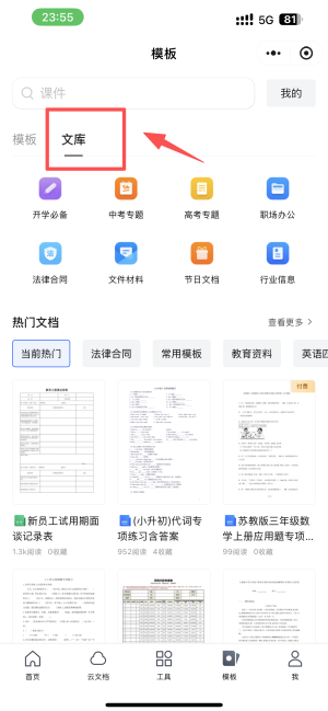 4、点击“文库”选项,浏览热门文档和分类文档。