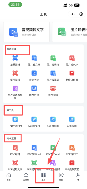2、点击“工具”选项,访问并使用各种文档处理工具。