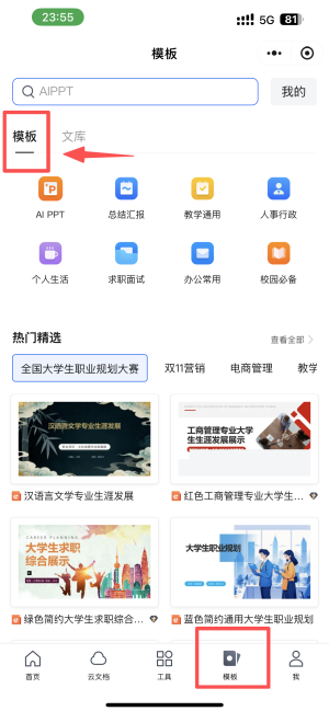 3、点击“模板”选项,搜索并选择需要的文档模板。