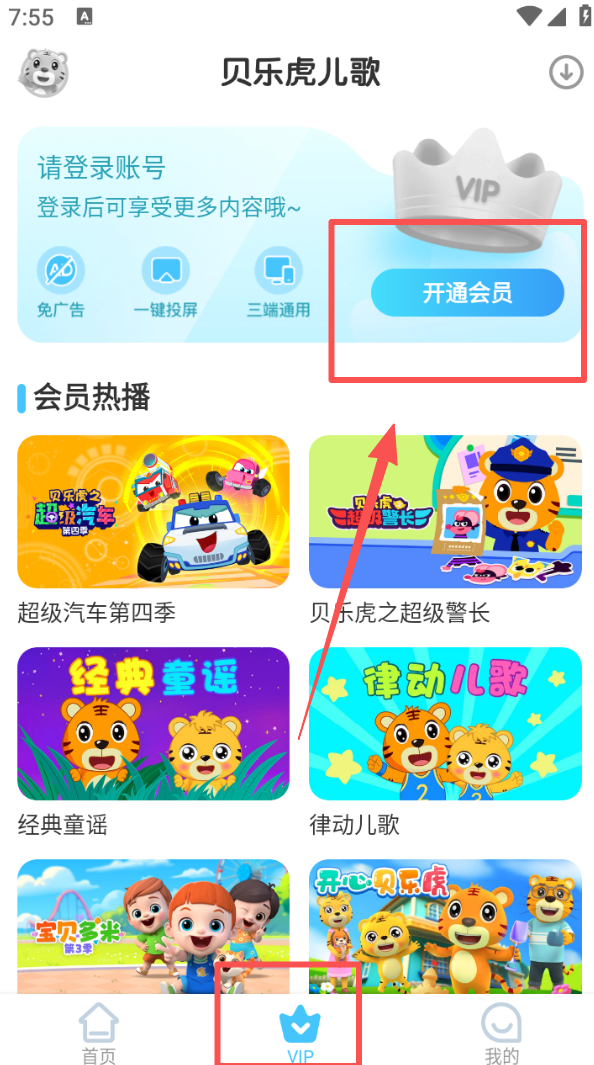 2、切换到 VIP 页面,点击 “开通会员”,能享受免广告、一键投屏等会员专属权益。