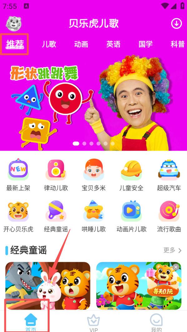1、在软件首页 “推荐” 板块,可浏览最新上架、律动儿歌等多样儿童内容分类。