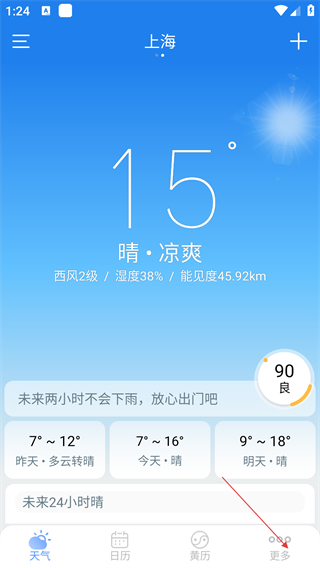 1、在天气主界面,查看上海实时天气,及未来时段气温预报。