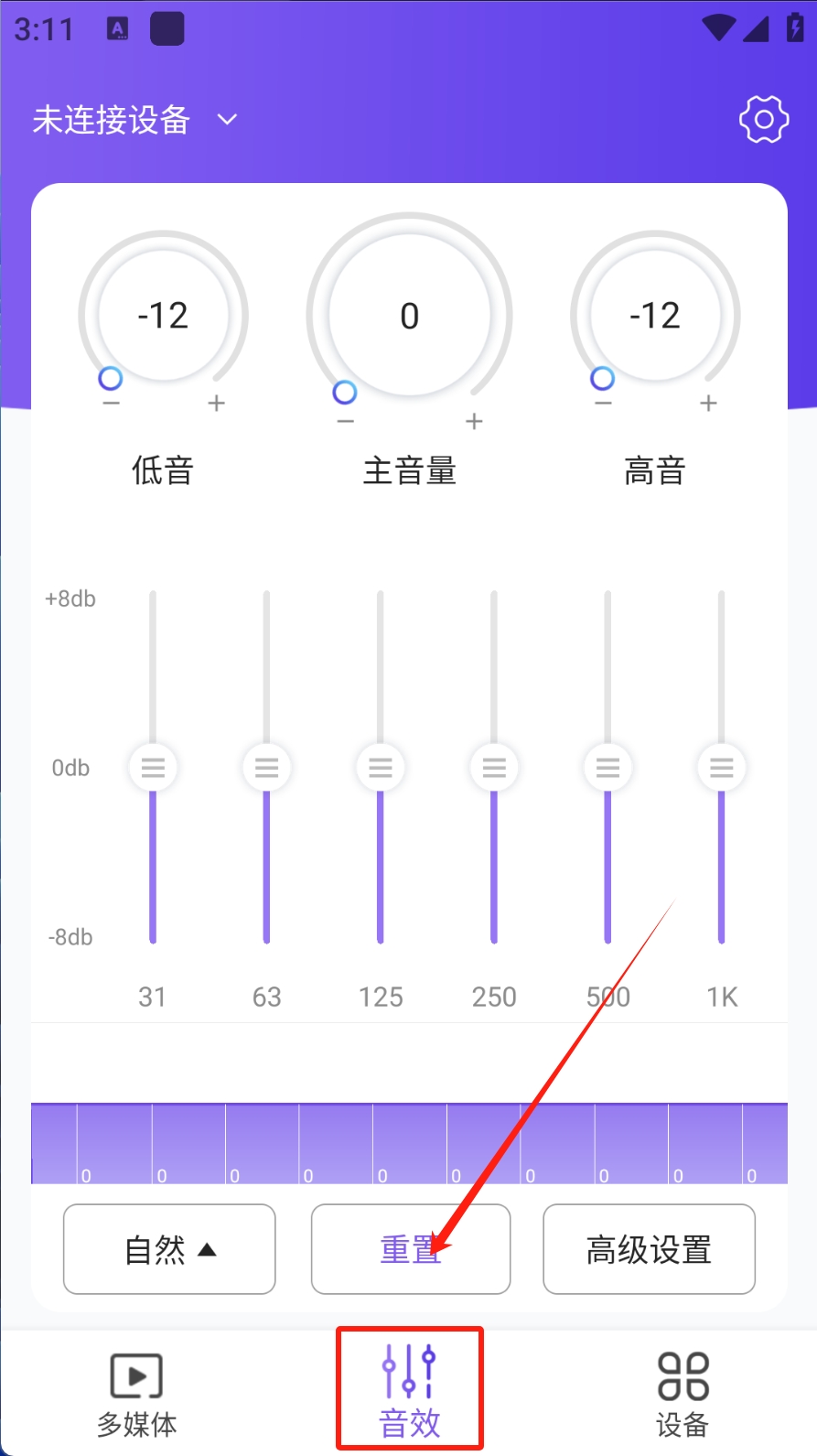 1、通过调整低音、主音量和高音来优化你的听歌体验,低音和高音的调整范围,可选择“自然”或“重置”模式。