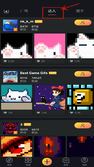 进入应用后,点击页面中间的方块按钮,就可以浏览广场上的动态和其他用户发布的作品。