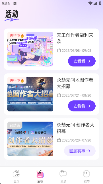 5、应用内设有“活动”板块,您可以在这里实时查看平台发布的最新福利活动、主题赛事以及创作挑战等推送内容。