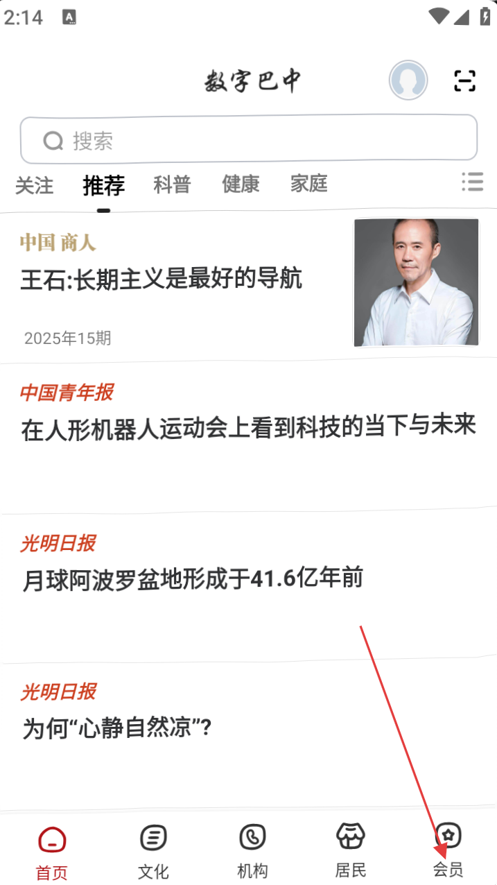 1、打开数字巴中,在首页点击底部【会员】入口,进入会员页面。