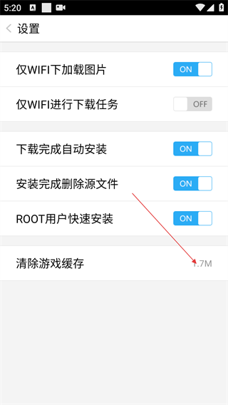 3、在【设置】页面中,可看到【清除游戏缓存】功能显示当前缓存为1.7M,该功能用于释放应用占用的存储空间。
