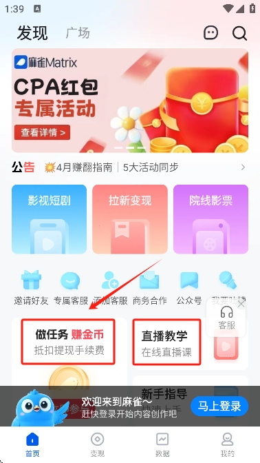 3、在首页,您可以浏览各种活动和任务,如“做任务赚金币”和“直播教学”,点击感兴趣的项目参与。