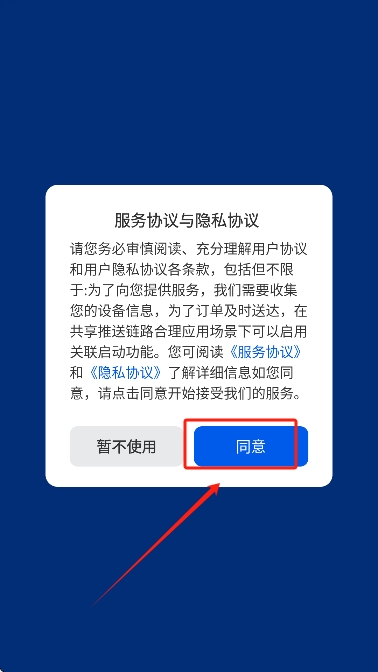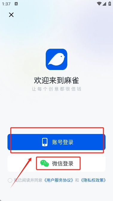 1、在启动麻雀APP时,阅读并同意服务协议与隐私协议,点击“同意”按钮以继续注册流程。