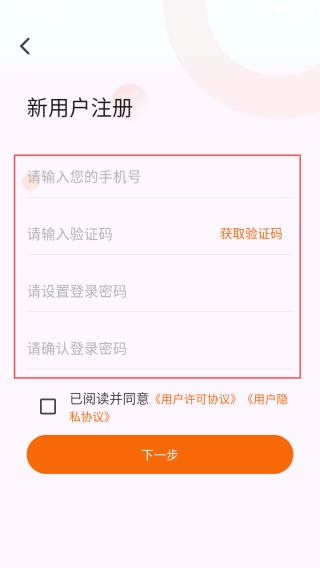 3、进入注册界面输入手机号和验证码以及密码即可注册。