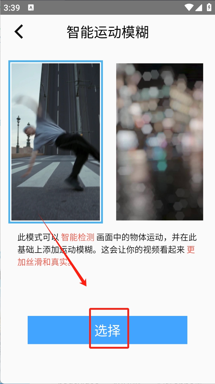 2、接着,点击“智能运动模糊”选项。此模式可智能检测并添加运动模糊,使视频更真实。