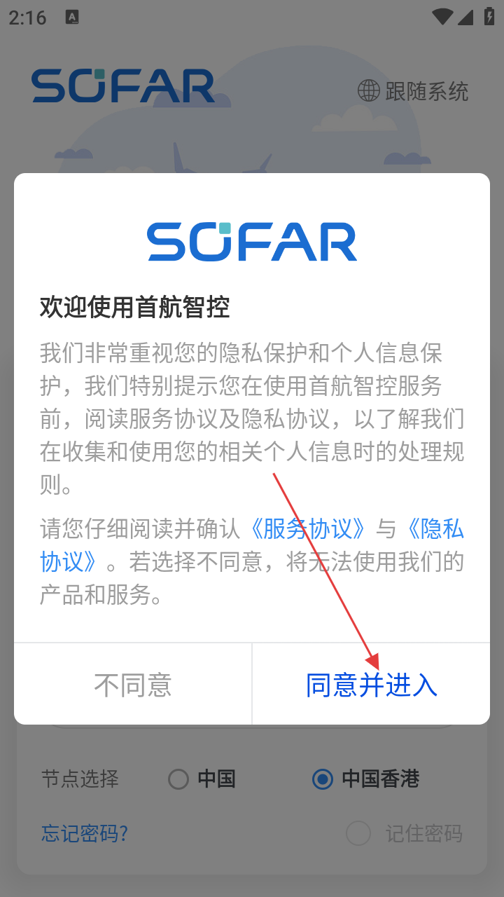 1、使用首航智控时,点击【同意并进入】接受隐私与服务协议。