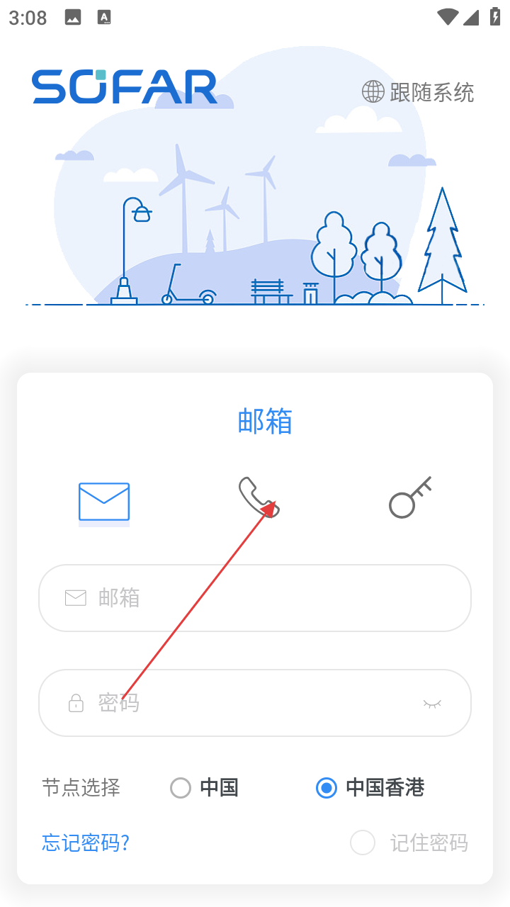 2、在登录方式选择页,点击电话图标切换至手机号登录模式。