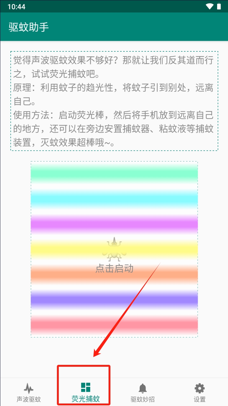 2、如果声波驱蚊效果不佳,点击“荧光捕蚊”按钮,尝试使用荧光棒驱蚊。