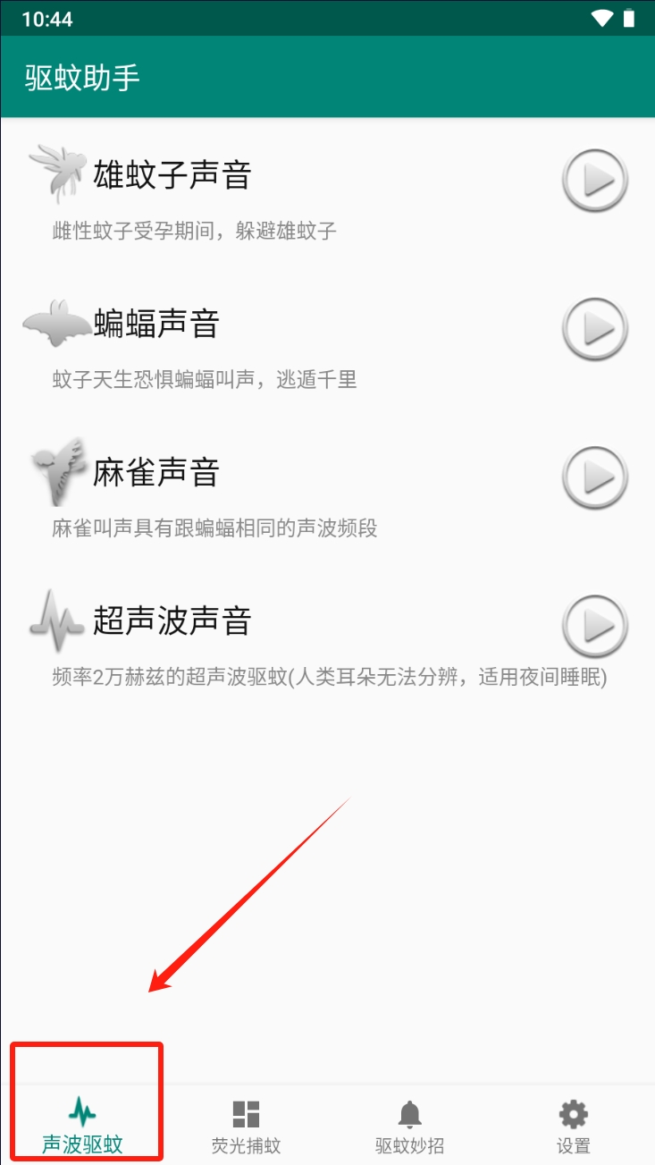 1、在首页点击“声波驱蚊”按钮,选择不同的声音模式进行驱蚊。