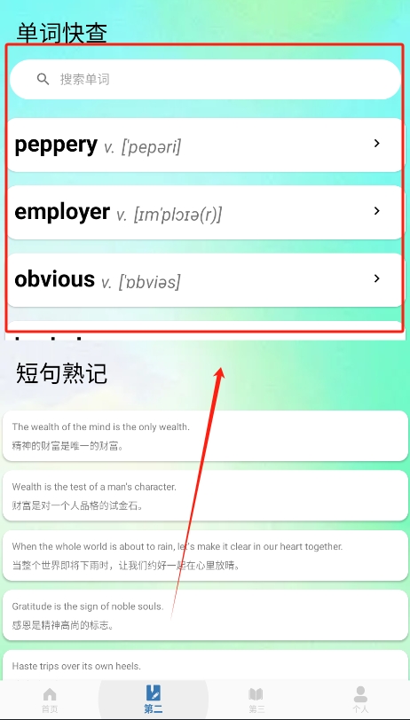 1、用户输入想要查询的英语单词,系统会迅速提供对应的中文释义及使用示例,确保用户对词汇的准确理解。