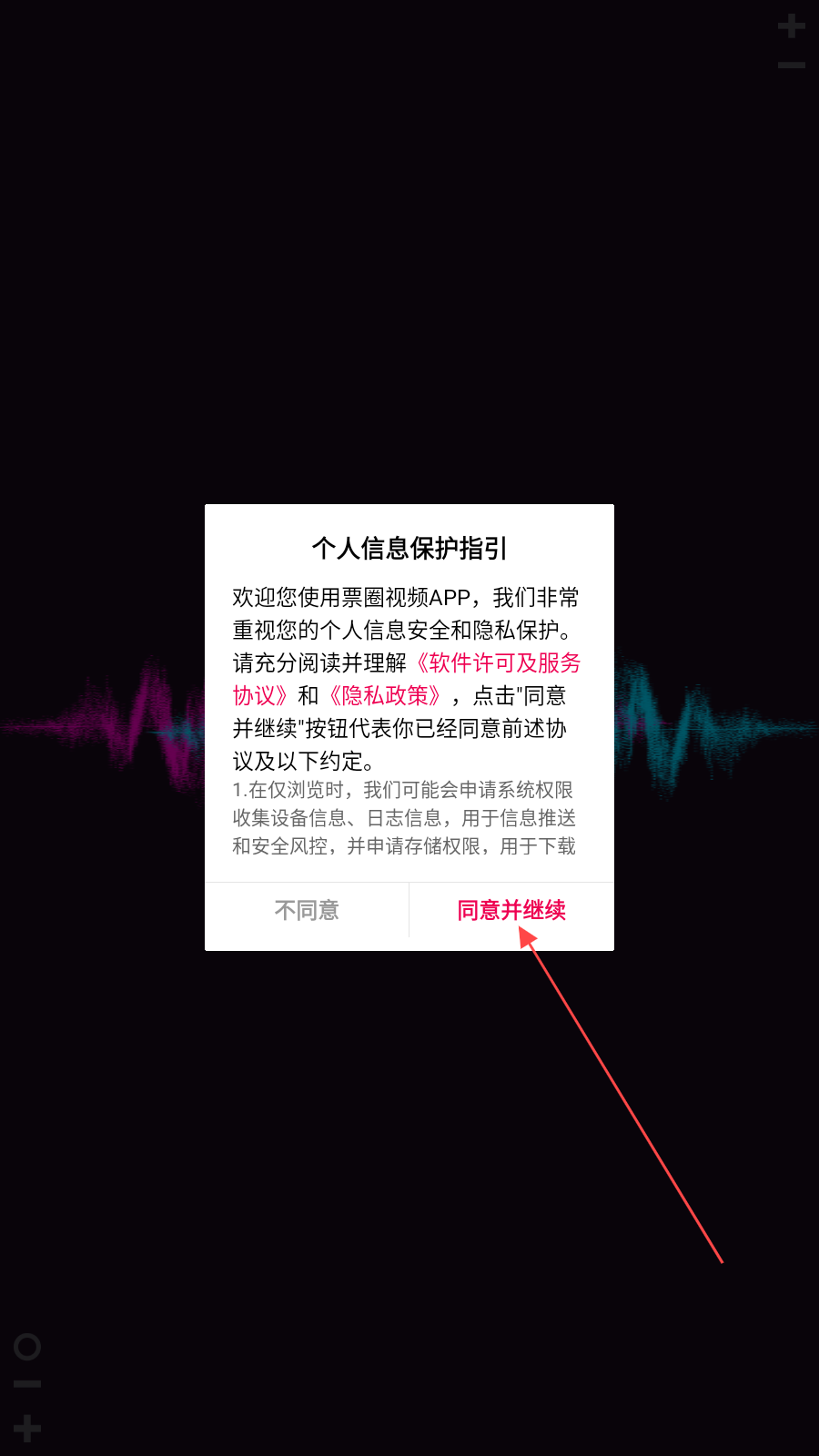 1、进入应用后,点击【同意并继续】。