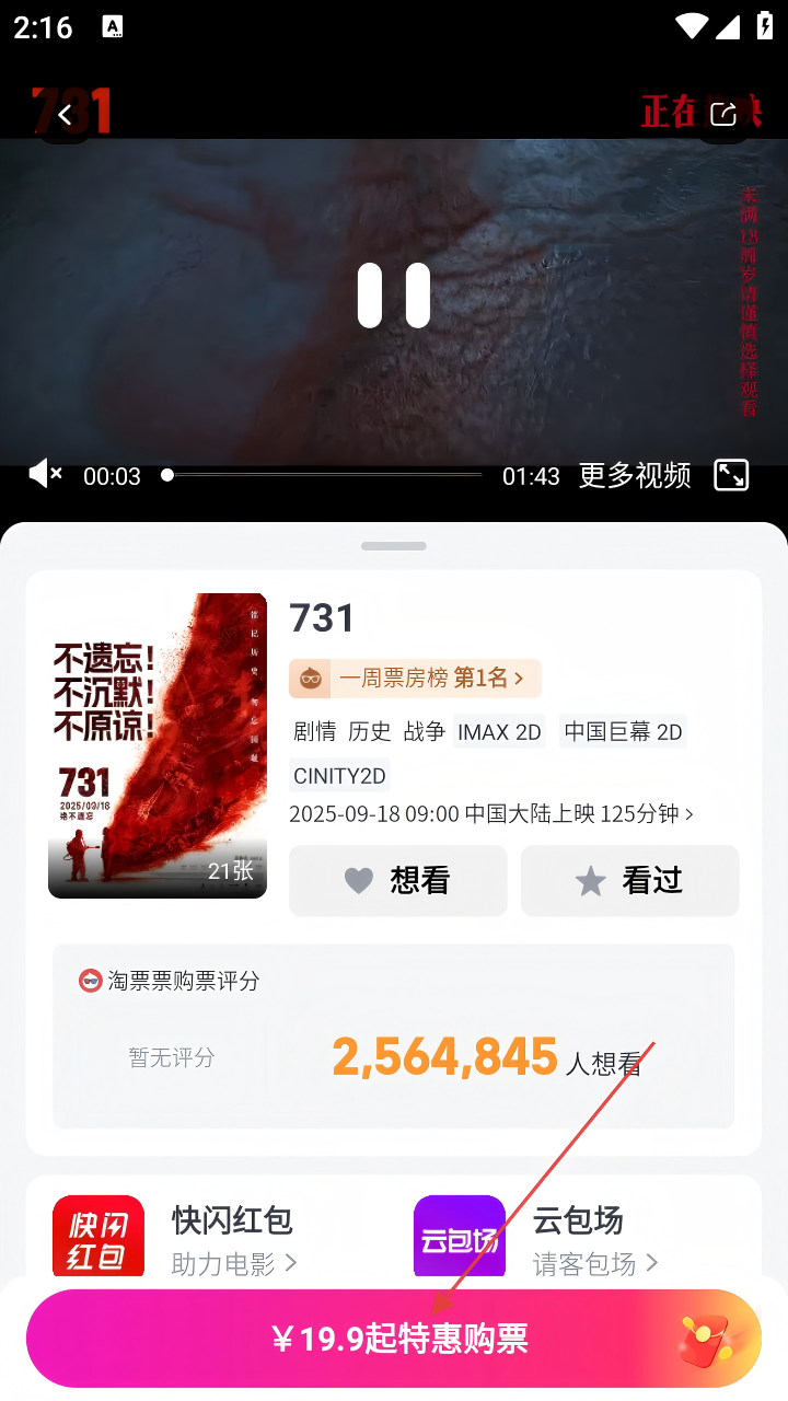 3、在电影《731》详情页,点击【¥19.9起特惠购票】。