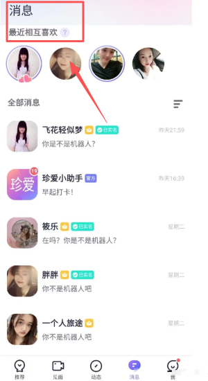 3、进入消息中心,回复“你是不是机器人”等互动,开启真实聊天。