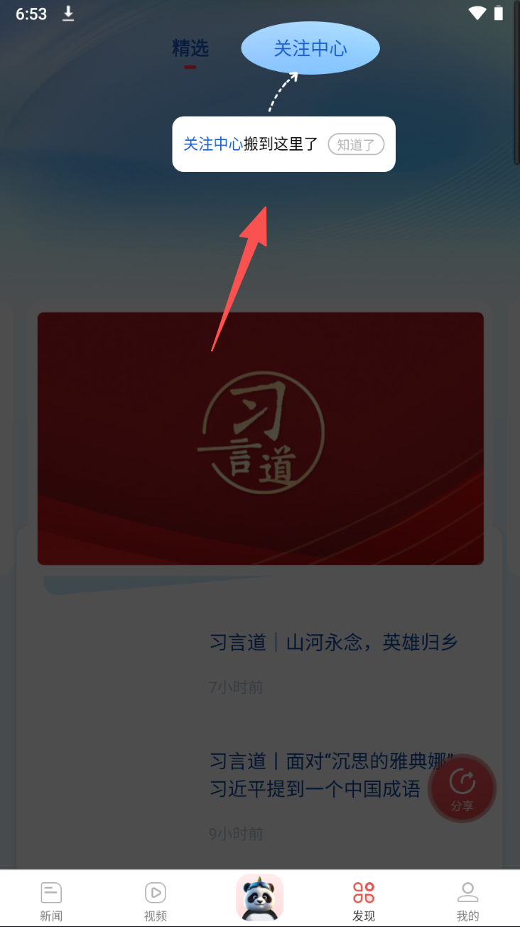 3、点击“关注中心”进入,管理你感兴趣的新闻话题。