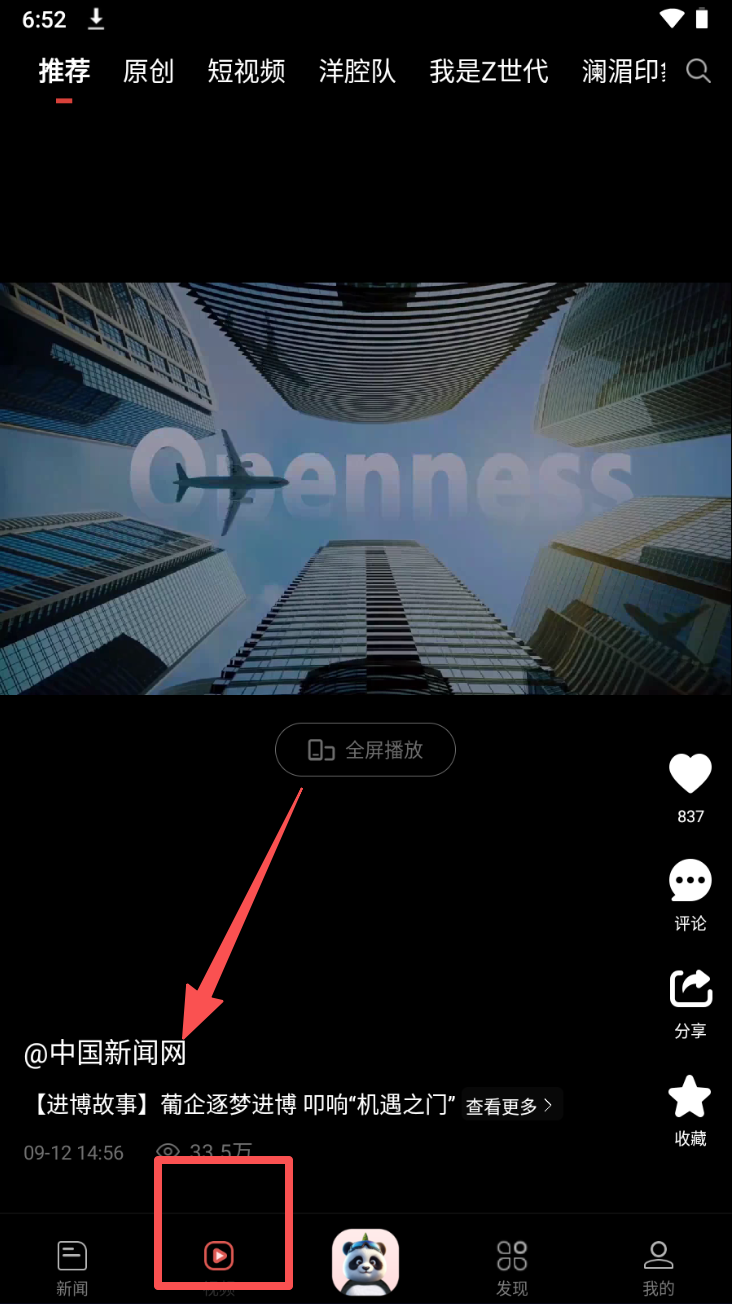 2、点击底部导航栏的“视频”图标,观看推荐的新闻视频。