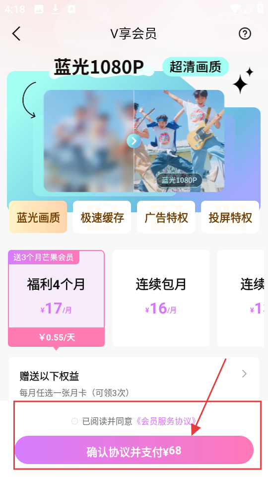3、进入会员开通界面,选好会员套餐后,勾选同意协议,再点击【确认协议并支付】按钮就行啦。