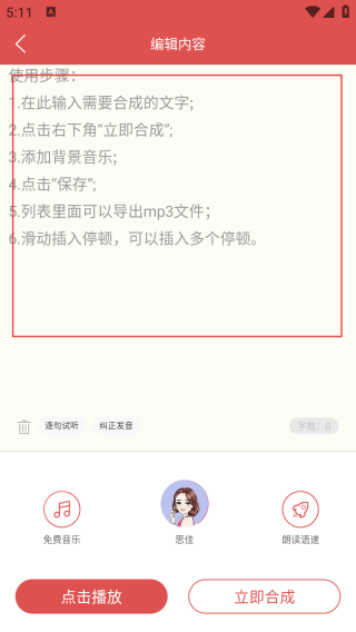 1、操作简单便捷:界面简洁直观,无需配音技巧,轻松完成语音合成,新手也能快速上手。