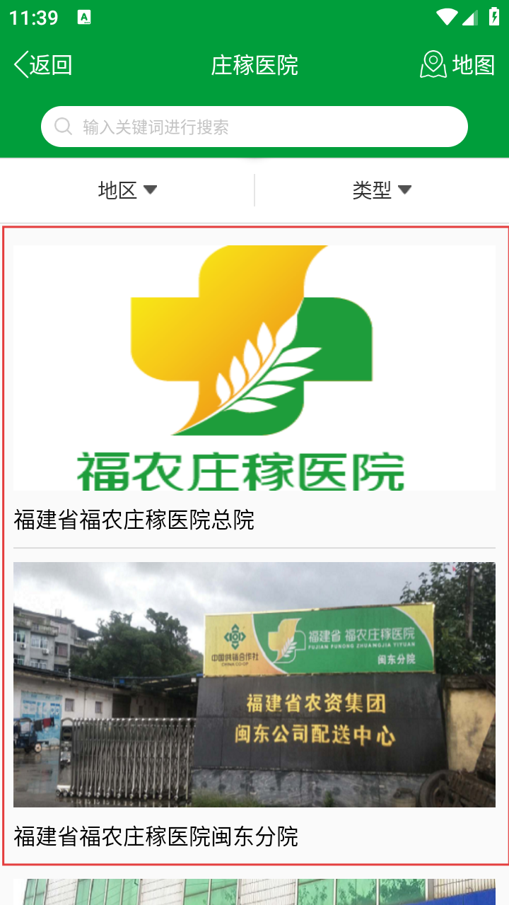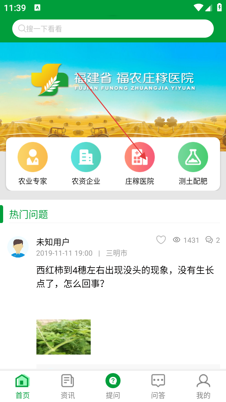 2、在首页点【庄稼医院】,进入医院列表查询界面。