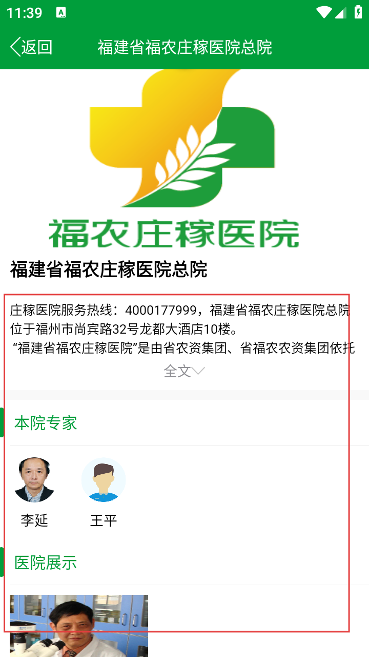4、进入总院详情页,可查服务热线、专家信息,点【全文】了解医院完整介绍。