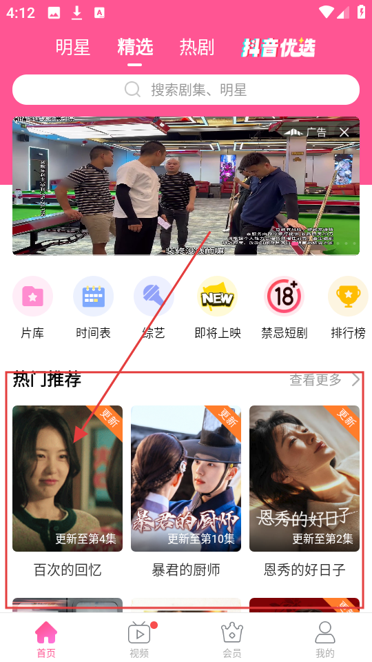 1、在应用首页,有【明星】【精选】等分类,还有热门推荐的剧集,能轻松找到想看的内容呢。