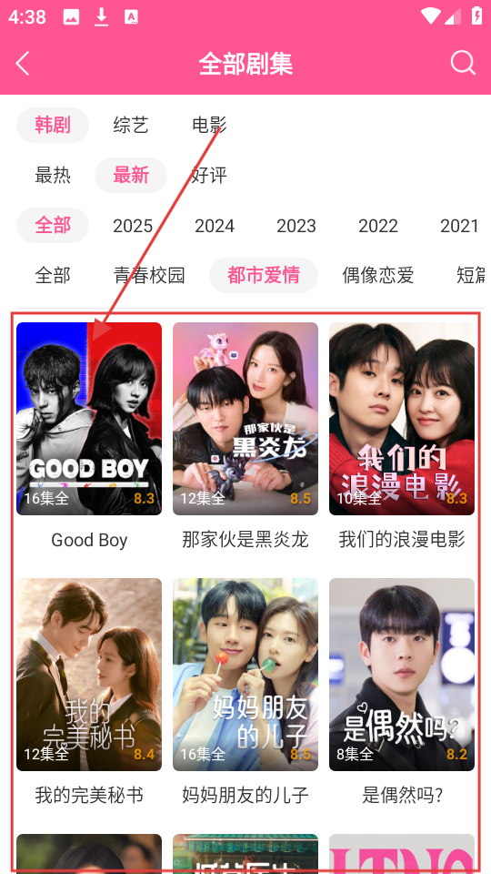 3、选好分类,比如【韩剧】【最新】【都市爱情】,就能看到对应类别的剧集,方便找到心仪的剧啦。