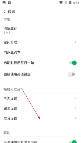 3、在设置页选择【发音设置】,可对发音语速、发音库等功能进行配置,适配个人听力学习的语音习惯。