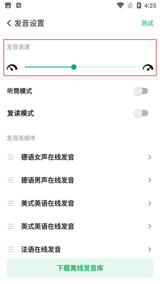 4、在发音设置页可拖动【发音语速】滑块调整语音速度,还能选择不同语种的发音库,优化听力练习体验。