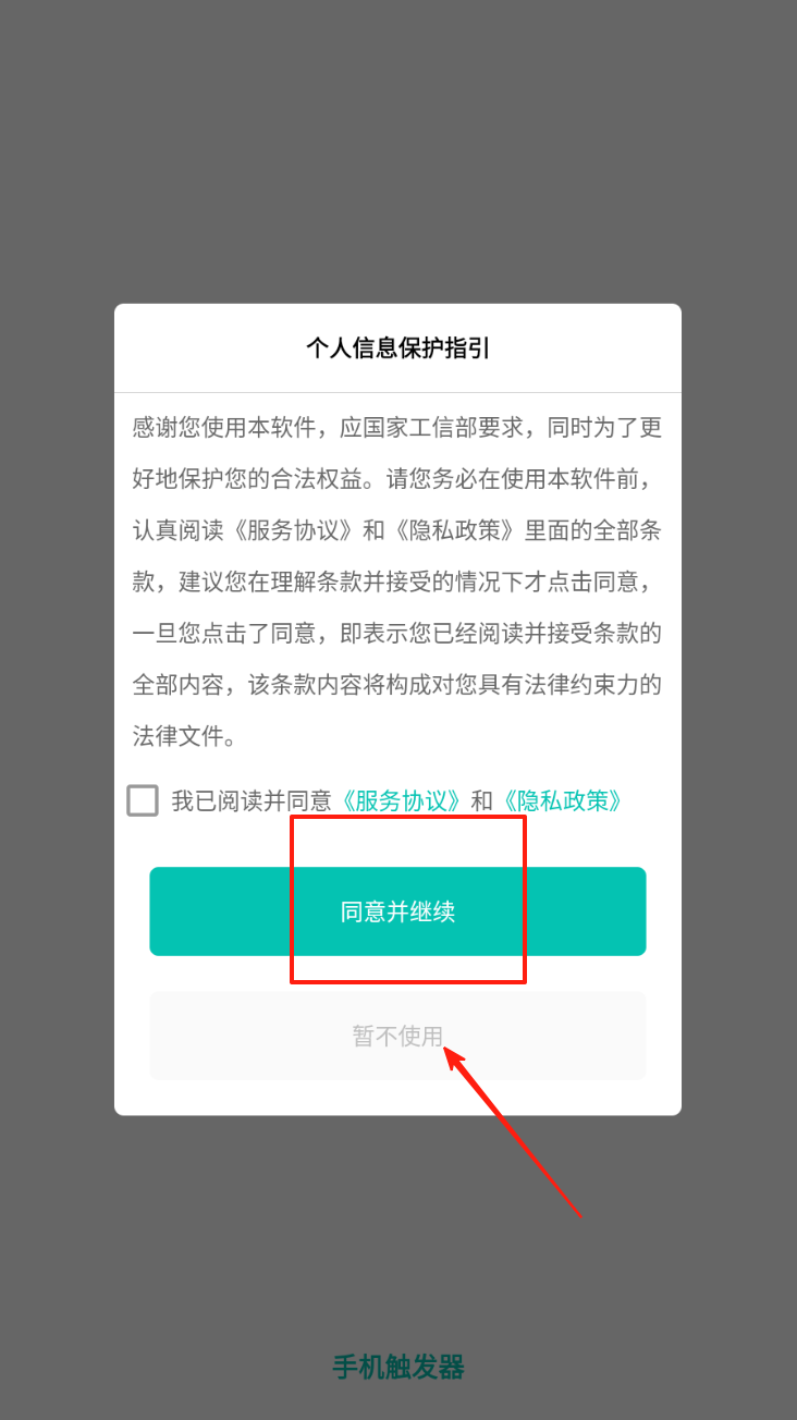 1、同意隐私政策:勾选同意框并点击“同意并继续”按钮,以接受服务协议。