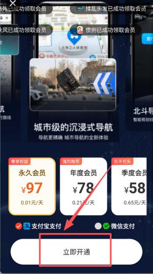 3、领取城市级沉浸式导航弹窗权益,选年度会员¥78立享0.21元/天。